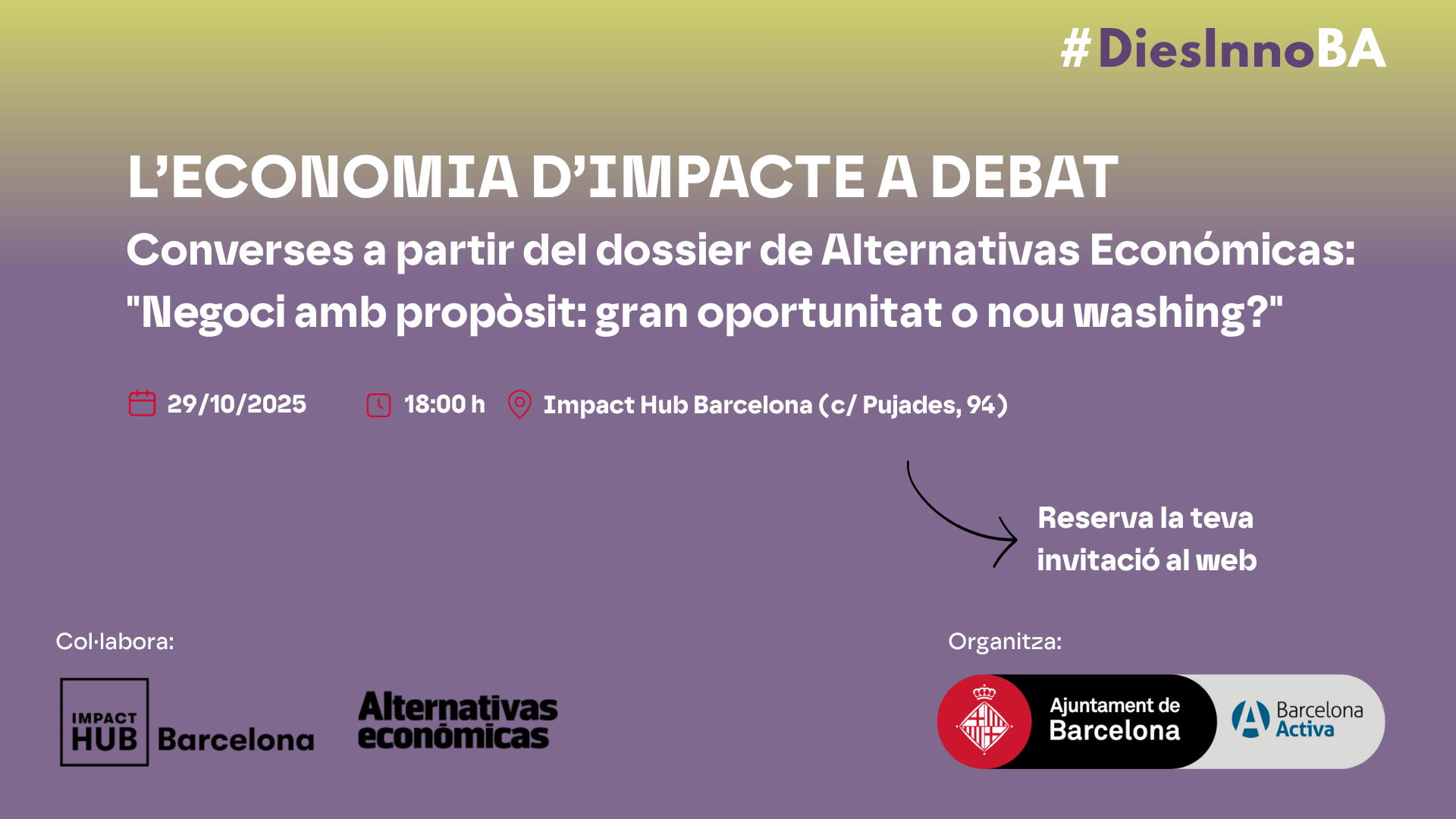 Activitat coorganitzada per Barcelona Activa, Impact Hub Barcleona i Alternativas Económicas, amb el suport de Tàndem Social en el marc del programa DiesinnoBA.